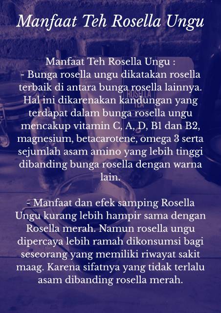 Teh ini terbuat dari bunga rosella ungu berpadu dengan daun teh pilihan yang kaya akan vitamin c .